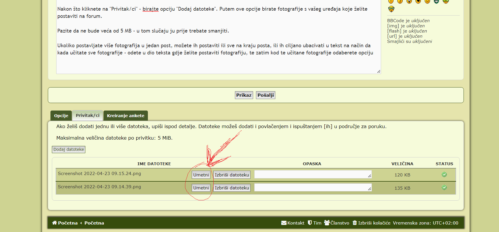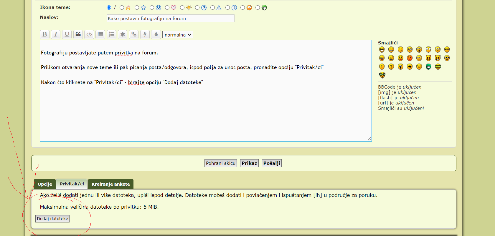 Prilikom otvaranja nove teme ili pak pisanja posta/odgovora, ispod polja za unos posta, pronađite opciju "Privitak/ci"